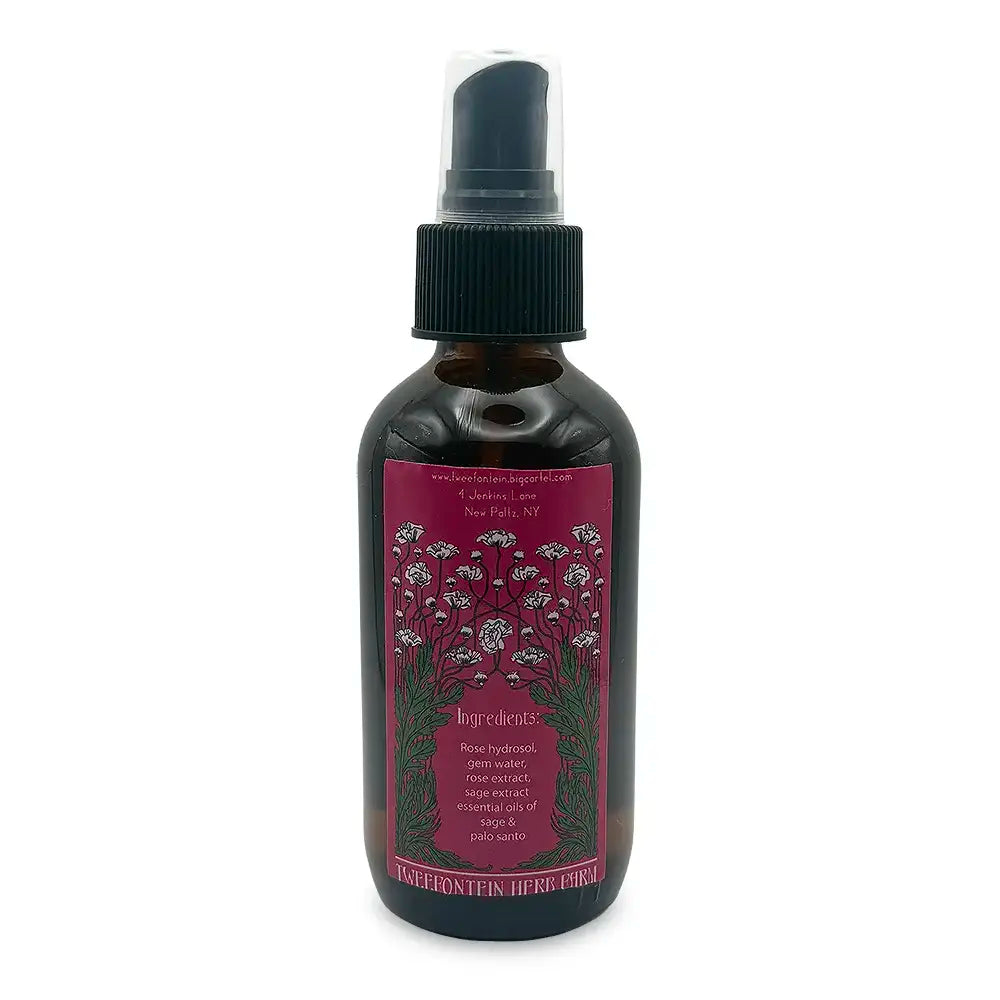 Tweefontein has been an operational herb farm since early the early 80's. Originally run by founder Anne Salomon, the farm continues to maintain her legacy by providing New York City Green Markets with high quality herbal teas and products. This spray is for the for the Rose Lovers! Rose Otto, Rose Hydrosols, Bergamot, Rose Geranium, a hint of Ginger.